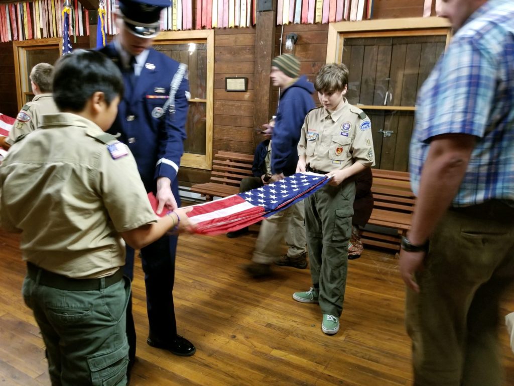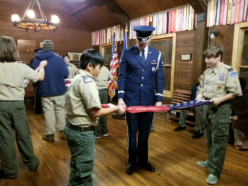 On Tuesday, December 10th, Troop 11 was visited by the Maxwell Air Force Base Honor Guard. They came and very kindly taught the boys of troop 11 how to fold flags and do colorguard. It was a great learning oppurtunity for the boys. The Honor Guard was very polite and respectful and overall were a pleasure to have. Once the meeting was over and learning was done for the day, they got in their van and went back, and we got in our cars, and went home.